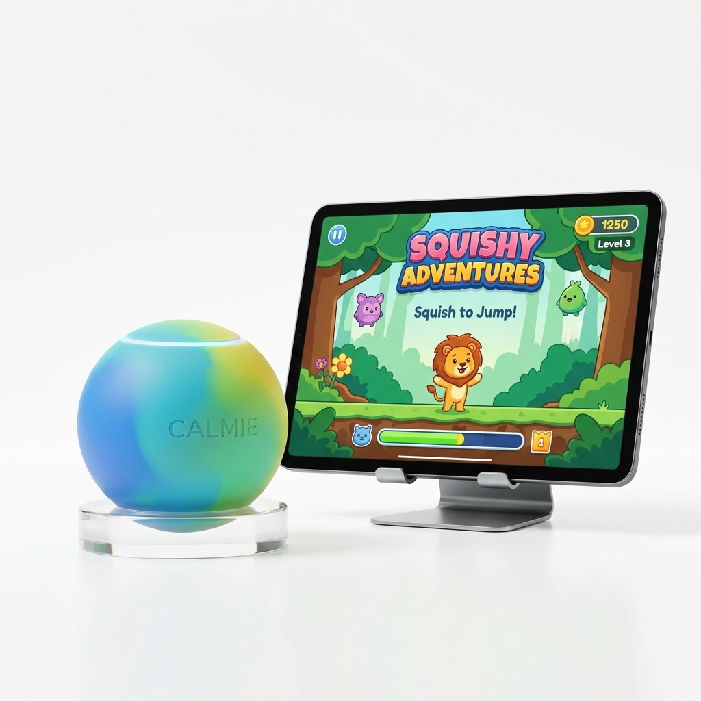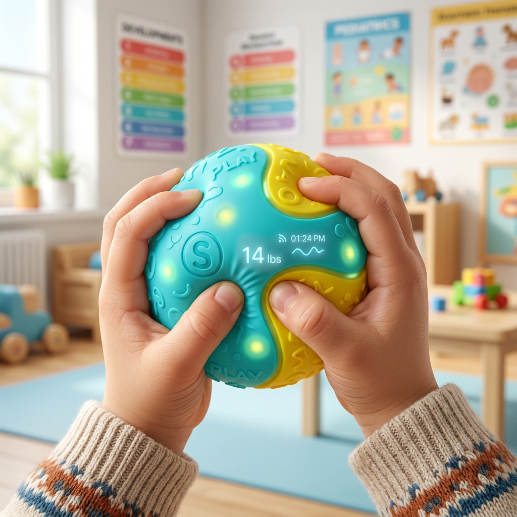 SenseSphere senses how hard a child squeezes, how steady they hold, and when they let go too early or too late — all through a built-in pressure sensor inside the soft body.