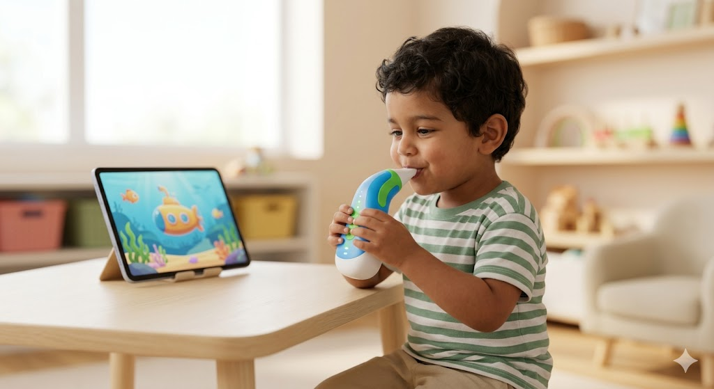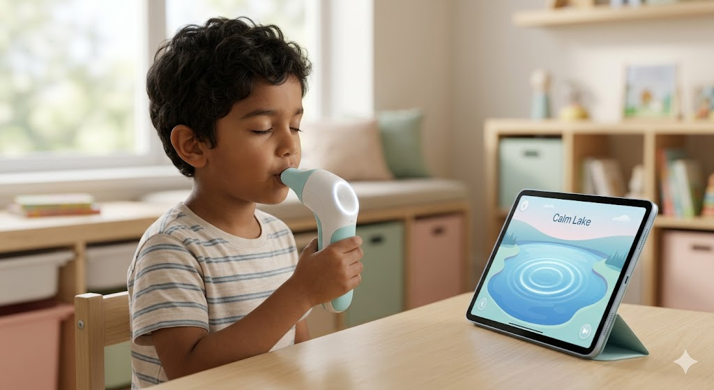 A breath-powered game controller for children — turning every blow, inhale, and moment of calm into on-screen play and measurable progress.